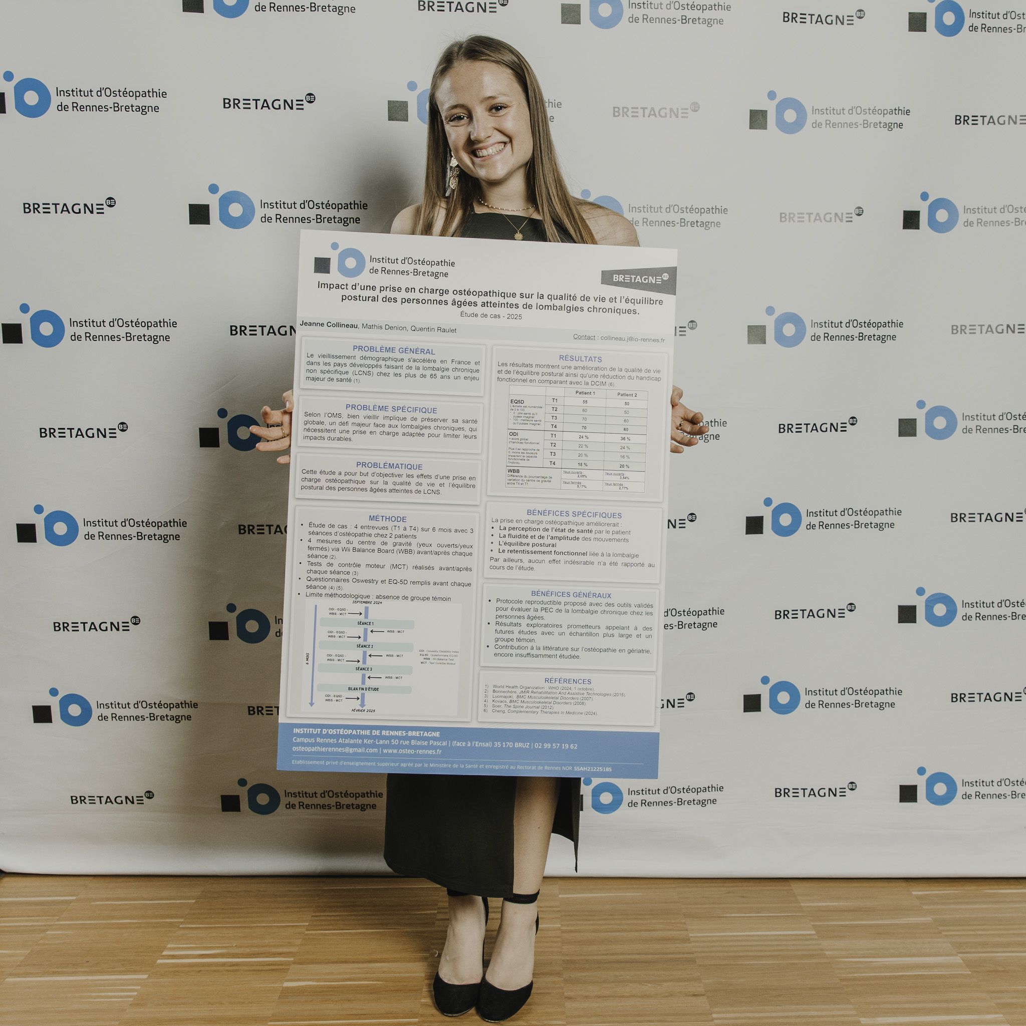 Sur la 2ᵉ marche du podium, Marion Viet a été récompensée pour son poster de recherche sur l’objectivation d’un conseil de fin de séance : de l’activité physique après une séance d’ostéopathie, un sujet concret et ancré dans la réalité clinique.